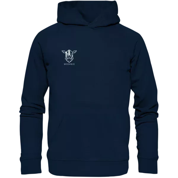 Der navy blaue Wodanio Hoodie hat das Wodanio-Logo in Weiß auf der rechten Brust. Auf der Rückseite steht, in weißer Farbe geschrieben, der Firmenslogan „Empowering Innovation. Simplifying IT. Wodanio.“, wobei der Name Wodanio in Firmen-CI-Geld abgehoben wird.